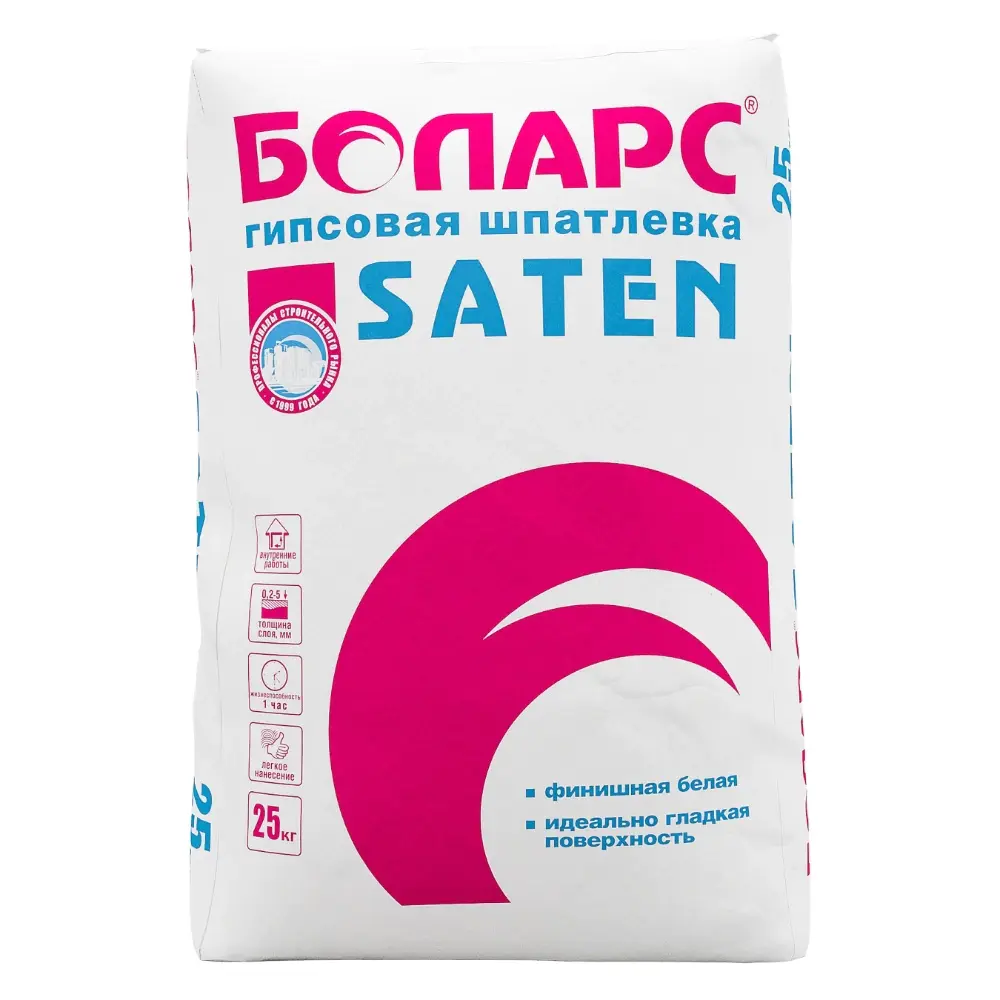 Гипсовая шпаклевка БОЛАРС Сатен предназначена для высококачественного тонкослойного выравнивания стен и потолков внутри помещений, устранения их недостатков, трещин, выбоин, а также заполнения стыков ГКЛ и ГВЛ с применением армирующей ленты. Пластична, благодаря чему удобна в нанесении и сведении слоев. Образует гладкую, плотную и прочную поверхность, хорошо шлифуется. Оптимальна для последующего нанесения требовательных декоративных покрытий и финишного окрашивания. Особенности и преимущества: - шпаклевка для финишного выравнивания слоем до 5 мм; - высокое качество итоговой поверхности; - безусадочна и устойчива к образованию трещин; - экологична, изготовлена из природных материалов. Обратите внимание: Продукт содержит гипс! При выполнении работ рекомендуем использовать средства индивидуальной защиты. Способ применения: Продукт наносится вручную на сухое, чистое, предварительно выровненное и загрунтованное основание, равномерно распределяется и разглаживается широким шпателем из нержавеющей стали. Дальнейшая отделка допускается после полного высыхания поверхности, но не ранее чем через 24 часа.